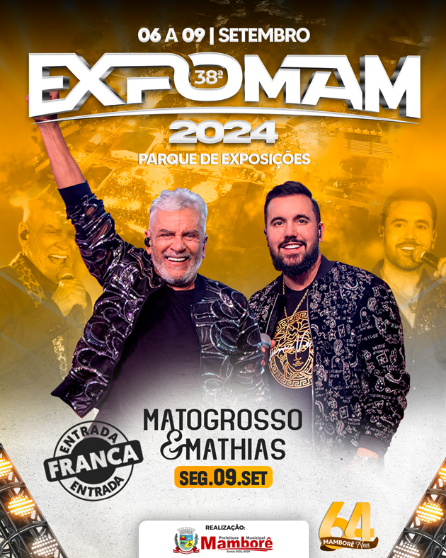 No dia 09 um mega show nacional, com Matogrosso e Mathias, um dos grandes nomes da música sertaneja do momento, relembrando as musicas do passado.